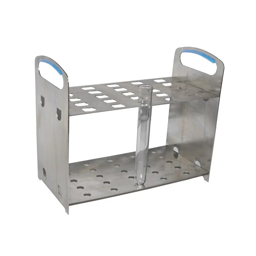 Штатив для плоских пробирок. Предназначен для установки в него плоских предохранительных пробирок. Изготовлен из нержавеющей стали, имеет 10 посадочных мест.