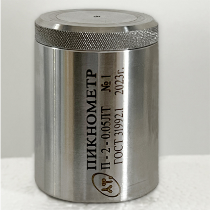 Пикнометр П-2-0,05ЛТ представляет собой гладко отполированный цилиндр из нержавеющей стали, стойкой к коррозии, с открытой верхней частью. Цилиндр оснащен плотно прилегающей крышкой с отверстием в центре и вогнутой внутренней поверхностью.
