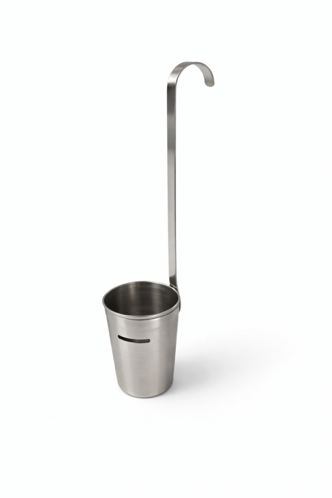Ковшик-пробоотборник представляет собой съемный стакан с носиком, плотно вставленный в кольцо-держатель, расположенный на ручке.