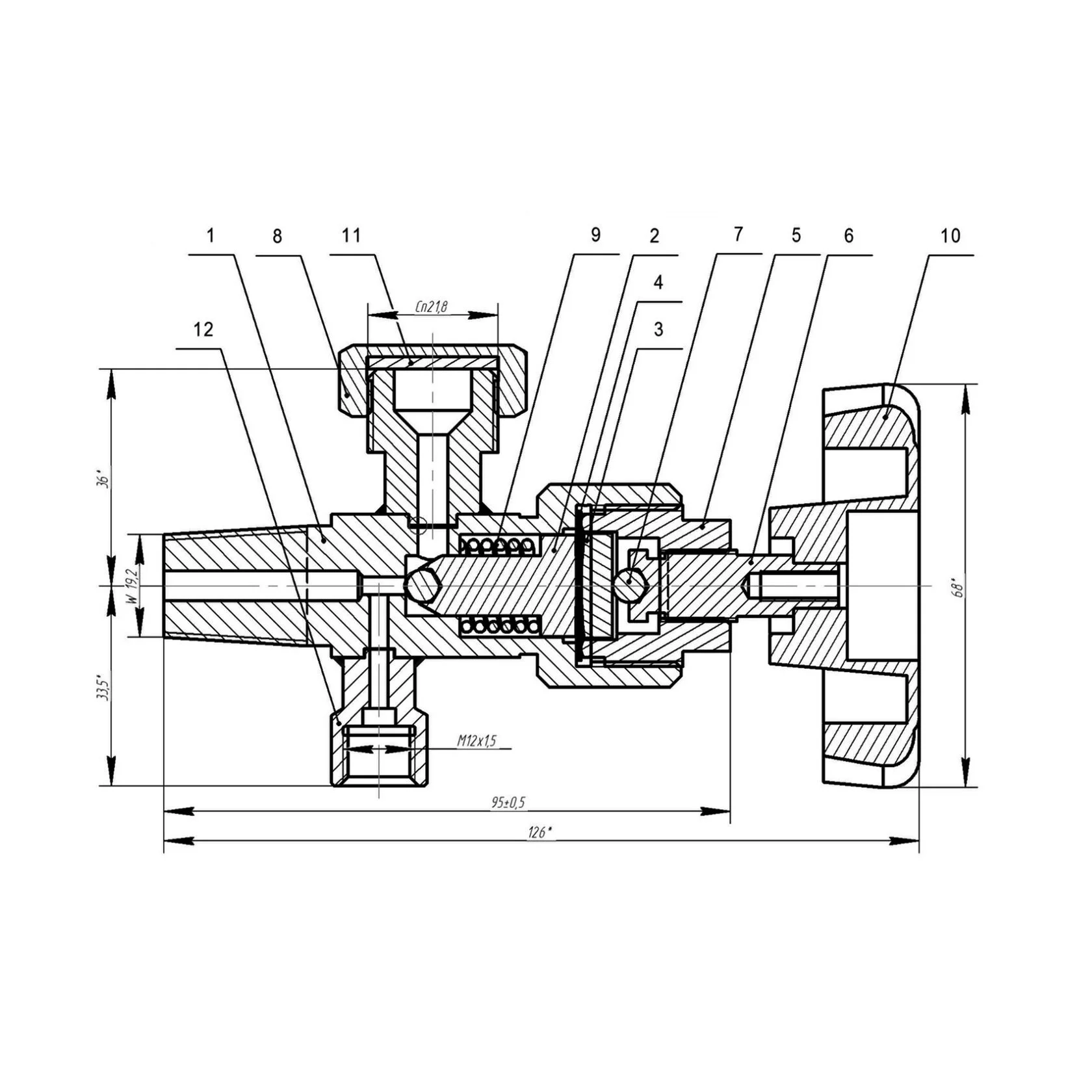 Присоединение: резьба коническая баллонная наружная W 19,2 ГОСТ 9909–81
