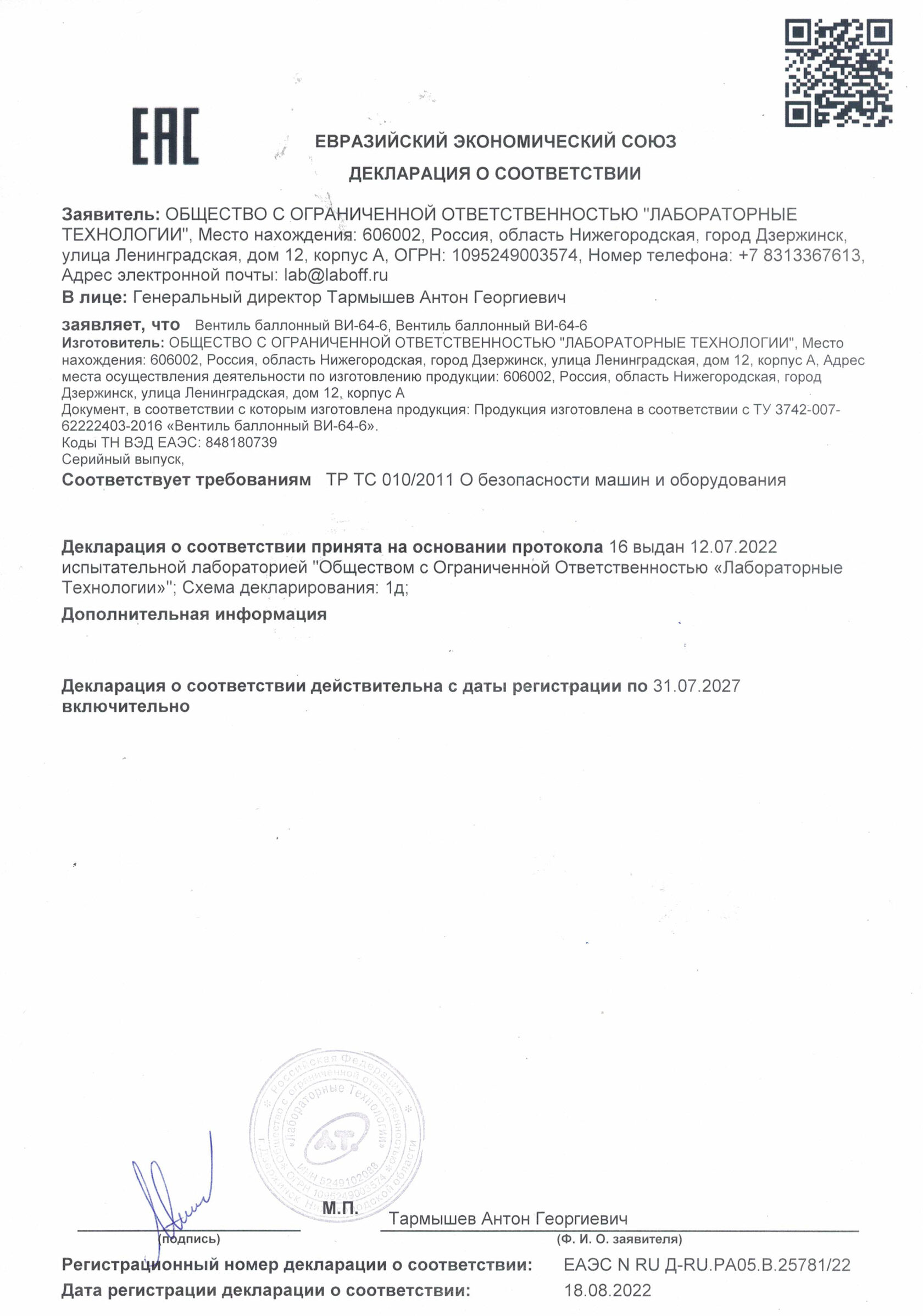 ТУ 3742-007-62222403-2016 и руководству по эксплуатации и признан годным к эксплуатации.